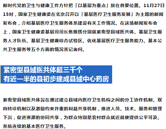 新时代党的卫生与健康工作方针把「以基层为重点」放在首要位置。11月27日15时,国家卫生健康委在北京召开以「基层医疗卫生服务发展」为主题的新闻发布会,介绍基层医疗卫生服务体系建......
