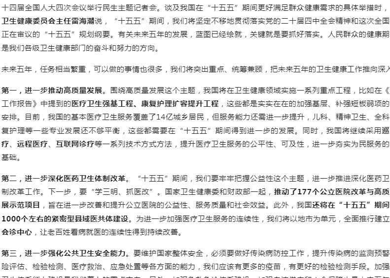 十四届全国人大四次会议举行民生主题记者会。谈及我国在“十五五”期间更好满足群众健康需求的具体举措时,国家卫生健康委员会主任雷海潮说,“十五五”期间,我们将坚定不移地贯彻落实党的......
